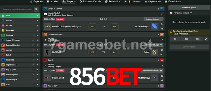O 856Bet oferece uma grande seleção de opções de apostas em e-sports com probabilidades competitivas